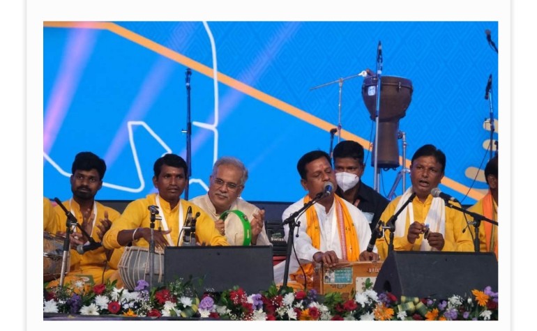 रायपुर, 07 अक्टूबर 2021 छत्तीसगढ़ की पौराणिक नगरी चंदखुरी में आज राम वन गमन पर्यटन परिपथ के उद्घाटन एवं माता कौशल्या मंदिर के नए स्वरूप में लोकार्पण के समारोह में जब वहां मंच पर श्री नंदकुमार साहू अपनी मानस मण्डली के कलाकारों के साथ भगवान राम और छत्तीसगढ़ की माटी की भावपूर्ण गौरव गाथा प्रस्तुत कर रहे थे, तब मुख्यमंत्री श्री भूपेश बघेल सहित वहां उपस्थित दर्शक भक्ति-भाव में भाव विभोर हो उठे। मुख्यमंत्री श्री बघेल अपने को रोक न सके और मंच पर जाकर कलाकारों की मण्डली के साथ जा बैठे। उन्होंने खंजरी बजाकर मानस मण्डली के कलाकारों के साथ संगत की और उनका उत्साहवर्धन किया।