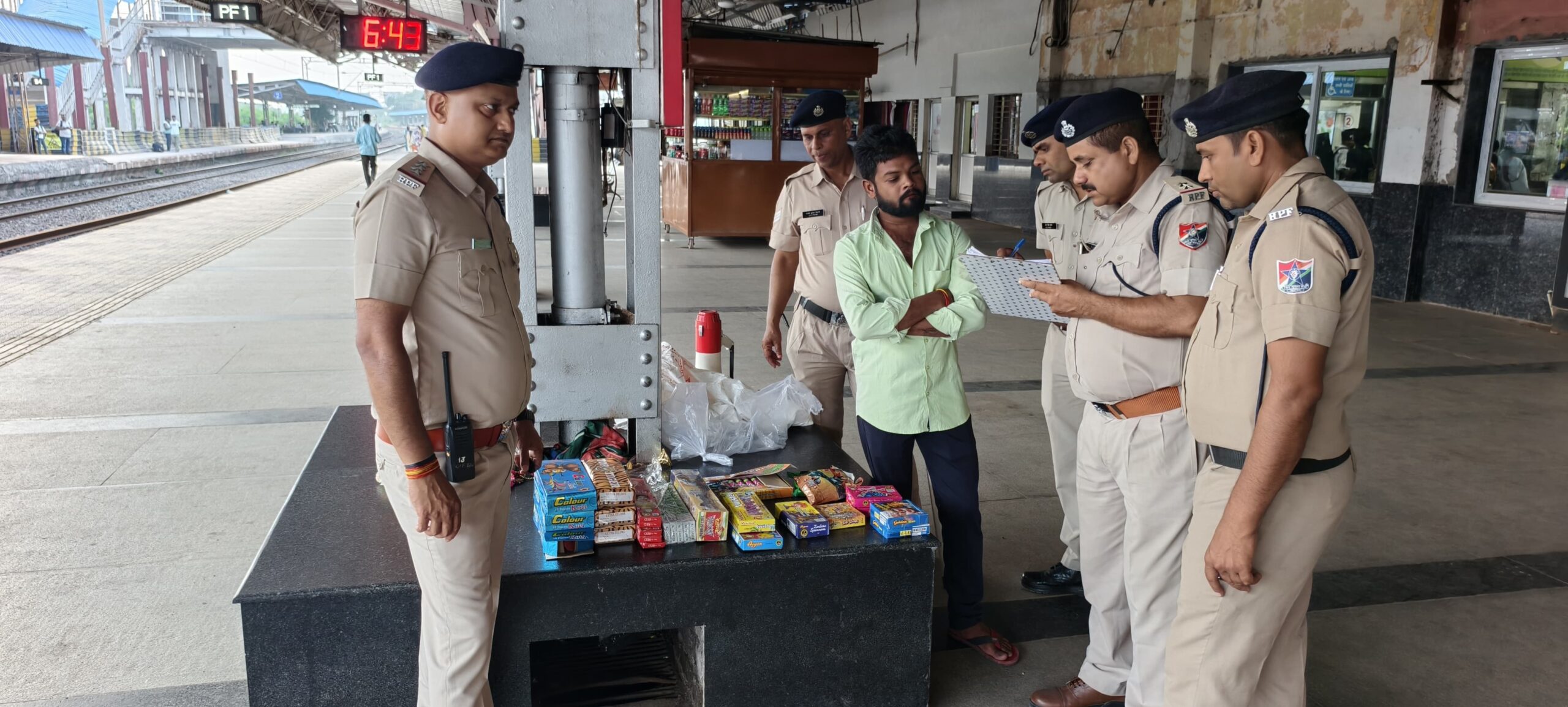 घटना के अनुसार, दिनांक 21.10.2025 को समय लगभग 16:40 बजे प्लेटफॉर्म क्रमांक 01 के मुख्य द्वार के पास एक संदिग्ध व्यक्ति को एक प्लास्टिक की बोरी लिए हुए देखा गया। तलाशी लेने पर बोरी में लगभग 15 प्रकार के विस्फोटक पटाखे पाए गए।