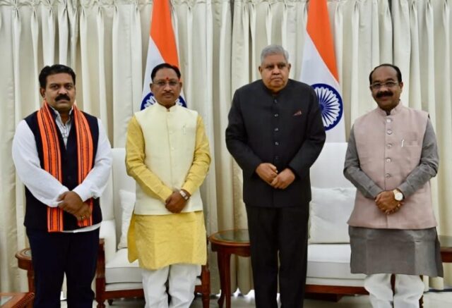 छत्तीसगढ़ के मुख्यमंत्री श्री विष्णुदेव साय ने आज शनिवार को सुबह नई दिल्ली में उपराष्ट्रपति निवास पर उपराष्ट्रपति श्री जगदीप धनखड़ से सौजन्य मुलाकात की