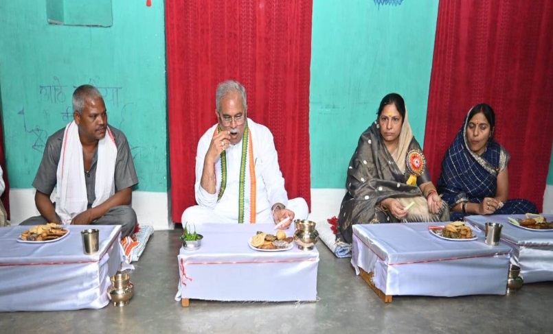 मुख्यमंत्री श्री भूपेश बघेल ने आज धरसींवा विधानसभा के ग्राम चरोदा में किसान श्यामसुंदर निषाद के घर स्वादिष्ट छत्तीसगढ़िया भोजन का स्वाद लिया। निषाद परिवार ने मुख्यमंत्री के उनके घर पहुंचने पर आत्मीय स्वागत किया। मुख्यमंत्री श्री बघेल को निषाद परिवार द्वारा बोहार भाजी, चिरपोटी टमाटर की चटनी, बथुआ भाजी, बैगन और बटकर की सब्जी, सेमी की सब्जी, इडहर, दाल, चावल, रोटी, मुर्कू, बिजोरी, बड़ा, ठेठरी, खुरमी, अईरशा और पपची जैसे स्वादिष्ट छत्तीसगढ़ी व्यंजन परोसे गए। विधायक श्रीमती अनिता योगेन्द्र शर्मा ने भी मुख्यमंत्री के साथ भोजन किया। मुख्यमंत्री ने स्वादिष्ट भोजन के लिए निषाद परिवार को धन्यवाद दिया और परिवार के सदस्यों को उपहार भेंट किए।