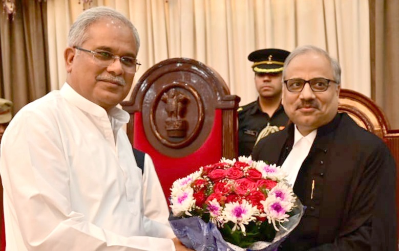 मुख्यमंत्री श्री भूपेश बघेल ने छत्तीसगढ़ उच्च न्यायालय के नव नियुक्त मुख्य न्यायाधीश श्री रमेश सिन्हा को आज राजभवन के दरबार हॉल में शपथ ग्रहण करने के बाद पुष्पगुच्छ भेंटकर शुभकामनाएं दीं।