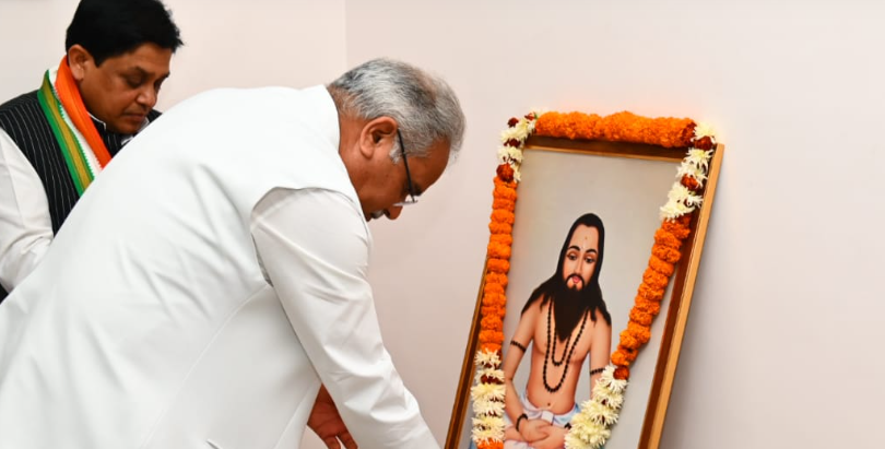 मुख्यमंत्री श्री भूपेश बघेल ने आज यहां अपने निवास कार्यालय में गुरु घासीदास बाबा की जयंती पर उनके छाया चित्र पर माल्यार्पण कर उन्हें नमन किया और प्रदेश की सुख, समृद्धि और खुशहाली की कामना की। मुख्यमंत्री ने इस अवसर पर प्रदेशवासियों को बाबा गुरु घासीदास जी की जयंती की शुभकामनाएं दीं। इस अवसर पर नगरीय प्रशासन एवं विकास मंत्री डॉ शिवकुमार डहरिया और छत्तीसगढ़ खनिज विकास निगम के अध्यक्ष श्री गिरीश देवांगन भी उपस्थित थे।