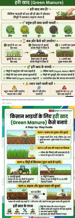 हरी खाद मिट्टी की उपजाऊ शक्ति, जैविक पदार्थ और नत्रजन (नाइट्रोजन) बढ़ाने के लिए उगाई जाने वाली दलहनी फसलें (जैसे- ढैंचा, सनई, मूंग, लोबिया) हैं, जिन्हें फूल आने से पहले खेत में ही जोतकर मिला दिया जाता है। यह मृदा की संरचना सुधारती है, नमी बनाए रखती है और रासायनिक खादों पर निर्भरता कम कर लागत घटाती है। हरी खाद का उपयोग मिट्टी के लिए किसी जीवनदायिनी संजीवनी से कम नहीं है।