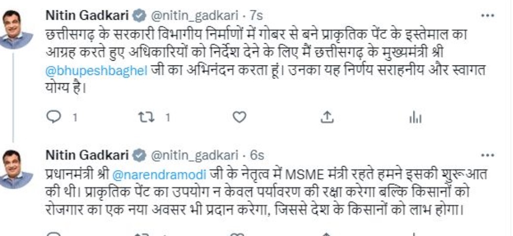 मुख्यमंत्री के इस फैसले का केंद्रीय मंत्री श्री नितिन गड़करी ने स्वागत किया है। श्री गडकरी ने ट्वीट कर लिखा है कि छत्तीसगढ़ के सरकारी विभागीय निर्माण में गोबर से बने प्राकृतिक पेंट के इस्तेमाल का निर्देश छत्तीसगढ़ के मुख्यमंत्री भूपेश बघेल ने दिया है, उनके इस फैसले का अभिनंदन करता हूं, मुख्यमंत्री भूपेश बघेल का ये फैसला सराहनीय और स्वागत योग्य है।